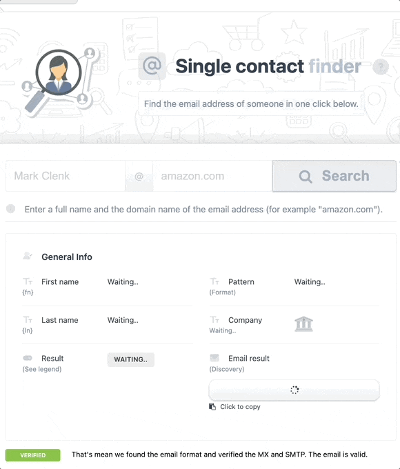 Find emails with just a name + company.- Find verified emails with just a name + company.